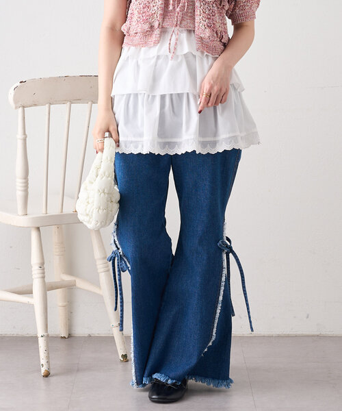 脚長効果抜群のフレアデニムパンツが登場!▼デザイン・フリンジ切り替えで前後ろ抜かりなしのデザイン◎・切り替え部分に施されたリボンがコーディネートのアクセントに♪・裾がフレアデザインになっているので、脚長効果抜群!▼コーディネート・カットソーと合わせたカジュアルスタイルは季節を問わず着こなせます♡・スカートと合わせたレイヤードスタイルもオススメ◎※洗濯、取り扱い洗濯:40度限度 手洗いアイロン:低温120℃まで スチームなし(あて布使用)タンブル乾燥:不可--------------------裏地:なし透け感:なし厚さ:やや厚い伸縮性:なし--------------------【商品のお気に入り登録】お気に入りアイテムの値下げ・再入荷・在庫1点などの通知を受け取ることができます。【ブランドのお気に入り登録】新商品や再入荷、セール、クーポン配布などお得な情報を受け取ることができます。※サイト上のカラー名と、お届け商品に記載されているカラー名が異なる場合がございます。※商品の色味は、撮影場所や光のあたり具合などにより色味が違って見える場合が御座います。また、お客様のお使いのPCのモニター環境などにより色味が違って見える場合が御座います。予めご了承の上ご注文下さい。※ご注文いただいた予約商品のお届け時期の確認は、注文履歴ページより行えます。
