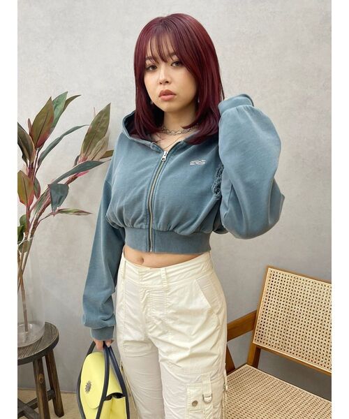 ■デザインブリーチ加工でヴィンテージ感を表現したクロップドパーカーです。今年らしいちょっぴりグランジ感のあるデザインがポイント。ウエスト部分までのクロップド丈なので、羽織るだけで腰の位置が高く見えスタイルアップ効果のあるパーカーです。■スタイリングデニムやスウェットなどカジュアルなアイテムにはもちろん、ロングスカートやワンピースなど、キレイ目アイテムに少しラフさを足したいときにピッタリ。-------------- 透け感:なし 裏地:なし 生地の厚み:普通伸縮性:なし --------------