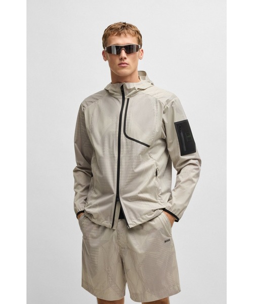 ラミネート加工のメッシュ素材で仕立てた、BOSS Menswearのジャケット。背面にベンチレーション、部分的にライニングを施し、通気性を高めています。ダブルジップを配しました。フードと裾は調節可能です。 【BOSS Green】 BOSS スポーツラインは、デザインと機能性を革新的に融合させたダイナミックなスポーツウェアを提案します。洗練されたディテールと強化されたパフォーマンス機能を組み合わせたアスレジャースタイルでタウン着にも最適です。 品番 50533763 原産国 インドネシア 着用例 Size M H188 B93 W79 H98 組成 表地: ポリエステル100%, メッシュ裏地: ポリエステル100% 【お取り扱い上のご注意】 濃色の製品は摩擦(特に湿った状態)や汗や雨などに濡れた場合、他のものに色移りする恐れがありますのでご注意ください。 激しい運動や過度な力が加わると、縫い目が開いたり、擦り切れや破れ、毛羽立ち、毛玉が生じる場合がありますのでご注意ください。 また着用の際は、バッグやアクセサリー、表面の粗い物などへ引っ掛かりに十分にご注意ください。 ストレッチ素材は永久的なものではなく、徐々に劣化が生じます。また、熱の影響で縮む性質がありますのでご注意ください。 プリント加工は永久的なものではなく、着用やクリーニングで徐々に薄くなり、ひび割れや脱落が生じます。 高温、高圧、濡れた状態でのアイロン掛けは芯地の縮みや生地を傷める原因になりますのでお避けください。 ボタンや装飾品へのアイロン掛けは、破損の原因になりますのでお避けください。 この製品は生地に樹脂加工をしております。樹脂加工品は時間の経過により(製造より約3年)徐々に樹脂に劣化が生じてしまう、寿命のあるファッション商品です。お取り扱いの際は次の点にご注意ください。 汚れが付着した際はこまめに湿らせた布で拭き取ってください。 光の当りやすい場所や高温多湿になる場所での保管は避けてください。 たたんでの保管は避けてください。 バッグなど固いものとの摩擦にご注意ください。 クリーニングの際は必ず樹脂加工品である旨をお伝えください。 直接のアイロン掛けはお避けください。 年に数回風通しの良い場所で日陰干しをしてください。