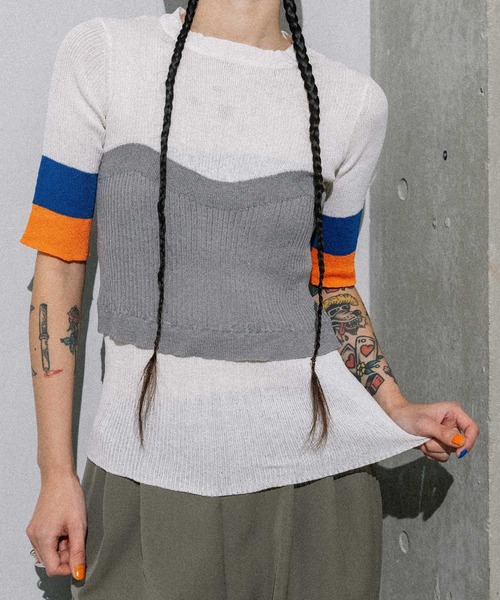 ■2025 SPRING SUMMER collection■ マルシャル定番、袖の配色がポイントのレイヤードデザインニット 鮮やかなカラー配色が今年らしい1枚 一枚で着るだけで、まるでビスチェをレイヤードしているようなデザインが特徴。スタイリング要らずのアイテムです。 袖口は、鮮やかな配色が目を引くポイント。全体のカラーは落ち着いているので、派手すぎず、大人の遊び心を感じさせるデザインです。 ボディラインに程よくフィットするリブニット素材を使用。伸縮性があり、動きやすく快適な着心地です。コンパクトなシルエットながら、窮屈感が少なくストレスフリーで着られます。デニムやワイドパンツでカジュアルダウンしたり、タイトスカートやスラックスと合わせてモードに決めたりと、さまざまなシーンで活躍します。1枚で主役級の存在感がありながら、着回し力も抜群の万能アイテム。トレンド感のあるデザインで、シンプルなコーデに取り入れるだけでおしゃれ度がグッと上がります! 【DESIGN】 ■デコルテラインを綺麗にみせてくれる程良い開きの衿ぐり ■本体に馴染むカラー配色のビスチェディテール ■肘上で長さのある袖丈で、袖口は鮮やかな配色 ■インナーにも使いやすい心地良いフィット感のある素材 【MATERIAL】 微光沢のポリエステル糸12Gリブで編立てています ・ハイゲージでしっかり目が詰まったリブ ・きれいめな表面感と着心地が良い肌触り *ビスチェ部分も同糸でリブを太めのピッチに変えて編立て立体感を出しています -------------------------- 裏地:なし 光沢感:微光沢あり 透け感:あり 伸縮性:あり 生地の厚さ:薄手 ケア方法:ホームクリーニング(手洗い) -------------------------- ◆お取り扱いについては商品についております品質表示にてご確認下さい。 *光のあたり具合いやパソコンなどのモニター環境によって実際の色味と異なって見える場合がございます。予めご了承ください。 *撮影時はサンプルの為、若干のデザイン変更等ある場合がございます。予めご了承ください。 <INFORMATION> ◆商品のお気に入り登録お気に入り登録していただいた商品は、完売商品の再入荷通知やラスト1点の通知、またクーポン発行やタイムセールの通知もお届け!ぜひご登録してください。 ◆ショップ・ブランドのお気に入り登録新商品や再入荷、ショップ・ブランドのお得な情報をいち早お届け!ぜひご登録してください。