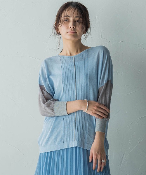 【デザインPOINT】透明感あるマリンムード、シアーバイカラーニット。ニットならではのテクニックを入れた、メリハリのあるデザイン。袖口、前中央には繊細なラメをあしらいました。透け感をヘルシーに着られる、ドルマンライクにゆとりを持たせたシルエット。裾に向かってしぼめたパターンで、IN/OUTがきれいにきまります。【スタイリング】今シーズンは、カーブパンツ、キュロット、ワイドシルエットボトムとの前裾INスタイルがおすすめ。【素材の特徴】【14G Ry/Ny 天竺表】マットな表情と、肌馴染みの良いタッチが魅力の、レーヨン/ナイロン細番手糸。天竺編みで透け感を表現。----------------------------------洗濯方法家庭洗濯:液温は40℃を限度とし、手洗いが出来る。自然乾燥:日蔭の平干しが良い。アイロン:底面温度110℃を限度としてアイロン仕上げができる。ドライクリーニング:石油系溶剤による弱いドライクリーニングができる。----------------------------------■モデル身長 166cm 170cm / 着用サイズ M※画像の商品はサンプルとなりますので実際の商品と仕様、加工、サイズが若干異なる場合がございます。※お客様のモニター環境により実際のお色と多少異なる場合がございます。※撮影状況や光の当たり具合により、色合いが異なって見える場合がございます。----------------------------------▼商品のお気に入り登録ハートマークをクリックし、お好きなカラーを選んでお気に入りに登録完売カラーの再入荷通知や、ラスト1点の通知、セールの通知も受け取ることができます。▼ブランドのお気に入り登録新商品や再入荷等、いち早くブランドのお得な情報を受け取ることができます。----------------------------------