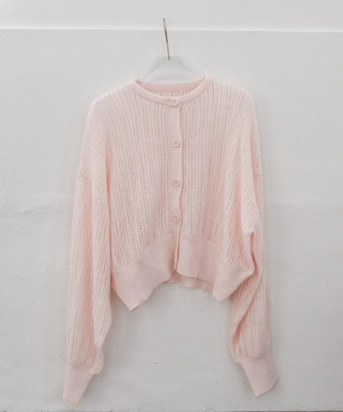 \透かし編みシリーズ/夏まで使える涼しげな糸を使ったカーディガンが登場! ヘルシーな肌見せを叶え、軽い着心地が魅力の1枚 ■デザイン 透かし編みのカーディガンは、一枚でサマになるトレンドを押さえたアイテム。 短すぎない絶妙な丈感がパンツでもスカートでも合わせやすく、 着るだけで今年らしいシルエットです。 同色のボタンなのでカジュアルになりすぎず、 様々なスタイリングにマッチ。 程よくゆとりのあるシルエットとボリューム袖がリラックス感を演出。 さらさらとした肌触りで軽量でシワになりにくく、 冷房対策や旅行などの持ち歩きにもおすすめのアイテムです。 羽織りとしても、ボタンを閉めて1枚でプルオーバーとしても、 一枚持っていれば様々なシーンで活躍する一枚です。 同じく透かし編みシリーズのタンクトップと組み合わせて着用も可能です。 ・AMHMS251003 メッシュタンクトップ 同じく透かし編みシリーズのプルオーバーも展開しております。 ・AMHMS251002 透かし編みクルーネックメッシュトップス ■素材感 さらさらとした心地よい肌触りの糸を使用したサマーニット。 シワになりにくく乾きやすい素材です。 ■スタイリング ボリュームスリーブで、シンプルなスタイリングでも着るだけで決まるアイテム。 今年らしいクロップド丈で全体をすっきり魅せ、スタイルアップ効果も抜群。 パンツスタイルにもスカートスタイルにも バランス良く着回していただけます。 抜け感が出るシアーインナーとのレイヤードも◎ 春先はキャミソールやタンクトップにさらっと羽織るスタイルや、 ワンピースなどの羽織りとしてロングシーズン活躍します。 ハイウエストのワイドパンツやロングスカートを合わせて クラシックな雰囲気で着るのも良し、 デニム合わせでカジュアルダウンもおすすめです。 ※ニット素材のため3センチ前後サイズに誤差が生じる場合がございますので、ご了承くださいませ。 ------------------------ 透け感/あり 光沢感/なし 伸縮性/あり 裏 地/なし 厚 み/薄手 ------------------------ ※自宅洗濯可能(単独手洗い) ※濃色品は、摩擦などにより他の衣類に色が移ることがありますのでご注意ください。 ※詳しいお手入れ方法は商品タグをご参照ください。 【SNS掲載情報】 @auntmaries.official 公式Instagramアカウントにて新作情報をはじめ 多彩なコンテンツを掲載しております。ぜひご覧くださいませ。 【商品のお気に入り登録】 完売カラーの再入荷通知やラスト1点の通知 プライスダウンの通知も受け取ることができます。 ぜひご登録ください◎ 【ブランドのお気に入り登録】 新商品や再入荷など、 ブランドの情報をいち早くお知らせします! ぜひご登録ください◎ ※ご注意※ ・屋外の光や照明の当たり具合で、実際の商品の色味と カラー別画像の色味に若干の違いが発生する場合がございます。 ・詳細画像と併せてご確認の上、ご注文いただきますようお願い致します。