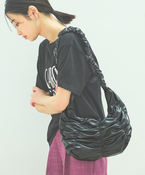 ギャザーデザインがポイントのショルダーバッグ。 フェイクレザーで丸みのあるシルエットが上品な印象のアイテム。 肩掛けや斜め掛けもでき、オンオフ問わずにお使いいただけます。 ハンドル部分はドロスト紐で長さ調整が可能です。 内側にはポケット付きで、収納力も◎