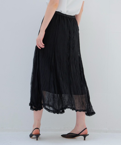 ■DESIGN メッシュガーゼのようなざっくりとした表面感が春夏らしい清涼感を感じるスカート。 腰回りはすっきり、裾にかけてフレアが広がるフィット&フレアのシルエット。 手作業で絞りを入れ、ナチュラルなワッシャー感を表現。 Tシャツやハイゲージのニットなど、質感の異なるアイテムとのスタイリングがおすすめです。 --------------------------- 透け感:あり 裏地:あり 伸縮性:なし ケア方法: ※お洗濯の際は洗濯表示を必ずご確認ください。 ---------------------------