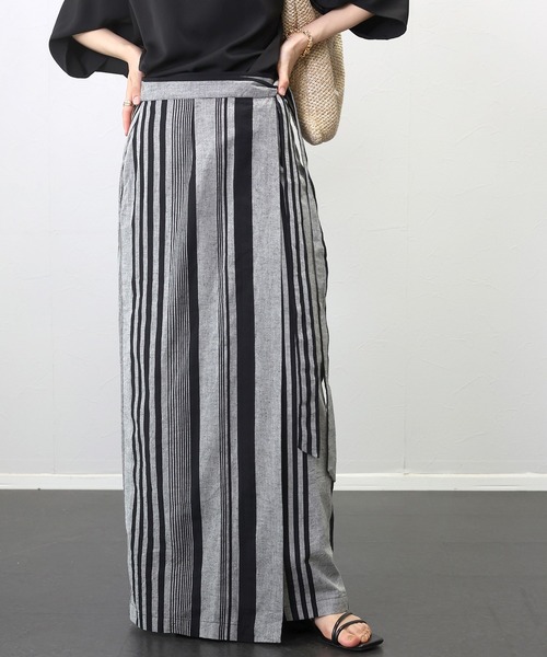【綺麗も快適も諦めない コットンリネンラップスカート】 着痩せ、快適さ、着映えのすべてをカバーする、 大人の悩みを解決する夏スカート。 風通しの良いスカートは暑い夏に涼しく、 しかも一点投入で女性らしさをしっかり出せる大人に嬉しいアイテム。 すとんとしたIラインのシルエットにランダムなストライプをあしらい、 さらに縦ラインを強調。 幅の違うストライプは黒を基調としたシックな印象で、 コーデをぐっと引き締めます。 着痩せ力抜群のシルエットながら、ラップデザインにすることで脚捌きは楽々。 ストレスのない穿き心地です。 ボタン位置でウエストのサイズを3段階調節できるのも嬉しいこだわりです。 生地は清涼感あるリネンにコットンをブレンドした柔らかなハイブリッド天然素材。 汗ばむ季節もさらり快適にお洒落を楽しめる一着です。 ■生地の特徴 清涼感あるリネンにコットンをブレンドした ハイブリッドな天然素材の生地です。 ■重さ 約320g …………………… 伸縮性:なし 透け感:ほとんどなし ポケット:なし 裏地:あり …………………… ※照明の関係より、実際の色よりやや明るく見える場合がございます。 またブラウザ環境の違いにより若干商品と画像の色目が異なる場合がございます。 予めご了承くださいませ。