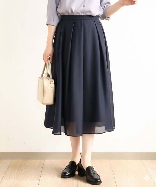 程良いシアー素材が軽やかなフレアースカート ■デザイン 程良い透け感が涼しげな印象のタックスカート。ふわっと広がるシルエットながらも、可愛らしすぎない絶妙なラインが通勤シーンにも重宝してくれます。ウエストは後ろゴム仕様でストレスフリーな着心地に。 ■素材 やわらかなシアー素材はふんわりと女性らしい印象に。程よい光沢感はきれいめコーデにも最適です。 ■コーディネート シンプルなフレアーシルエットはトップスを選びません。ウエストにインするとよりきちんと感がありきれいめなバランス感で着こなせます。 -------------------- 着用シーズン 春:○ 夏:◎ 秋:△ 冬:×#オフィスカジュアル #食事会 #体型カバー -------------------- 洗濯表示:手洗い可 透け感:ややあり 裏地:あり 伸縮性:なし ウエスト:後ろゴム仕様 生地の厚さ:やや薄手~ふつう -------------------- ※自然光・照明の関係、パソコン・スマートフォンなどの環境により、実際と色味が違って見える場合がございます。予めご了承ください。商品の色味は、詳細画像をご参照ください。 ※サンプルでの撮影となるため、実際にお届けする商品と仕様やサイズが異なる場合がございます。 -------------------- ■気になるアイテムは『お気に入り登録』が便利! <お気に入り登録とは?> 気になるアイテムの「ハートマーク」をクリックするだけで、簡単にリストに追加できます。 <おすすめポイント> 1.ラスト1点や再入荷の通知を受け取ることができます。 2.登録していただいた商品だけが対象となる、あなただけのタイムセールが開催されます。 3.マイページの一覧からお気に入りをまとめて確認でき、自分だけの欲しいものリストがつくれます。