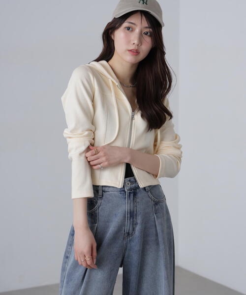 〔fabric&design〕 コンパクトなボディに沿ってくれる、ストレッチの効いた薄手のダンボール素材を使用。 裏毛ほどカジュアル感はなく、でも表面は表情のあるリブ地で、すっきりとした印象に仕上げました。 ウエストをシェイプさせたコンパクトなボディと長めの袖丈がポイントです。春夏は羽織として、 秋口など肌寒い時期にはジップを閉めてプルオーバー感覚で着用していただくのがおススメです。 ジップは逆開仕様なので、インナーとのレイヤード見せはもちろん、ボトムスとのバランスも取りやすいです。 〔styling〕 カジュアルなパーカーアイテムをあえて甘さのあるスカートと合わせたり、 デニムパンツをあえてワンサイズ大きくルーズにはいて、ジップで肌見せするスタイリングがおススメです。 ------------------------------------------------------ ◆商品のお気に入り登録◆ お気に入りアイテムの値下げ・再入荷・在庫1点などの通知を受け取ることができます。 ◆ブランドのお気に入り登録◆ 新商品や再入荷、セール、クーポン配布などお得な情報を受け取ることができます。 ------------------------------------------------------
