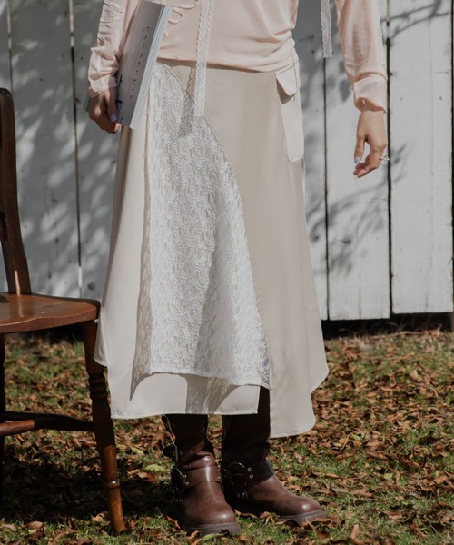-レースレイヤードスカート-トレンドのボトムのレイヤードスタイルが1枚で簡単に叶うこだわりスカートが登場。贅沢に4種類の生地を使用し、ポケットやレイヤード風デザインなど1枚でこなれ感たっぷりな印象です。スカートのデザインを際立たせるシンプルなトップスに合わせたコーディネートがおすすめです。