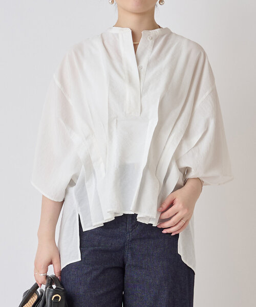 ■アイテム ウエストに施したタックが目を惹くブラウス。 首回りはすっきりとした印象を与えてくれるノーカラーデザイン。 ヒップにかかる丈感で気になるお尻周りをさりげなくカバーしてくれます。 袖まわりがゆったりしていてさらっとした着心地のブラウスは暑い時期にもぴったり。 前後差のあるデザインなので、細身のパンツからワイドボトムまで相性良く着ていただけます。 1枚で主役になるアイテムです。 ▼おすすめスタイリングアイテム デニムストレッチスリムパンツ ■素材・洗濯表示 素材:レーヨン74% ナイロン17% 絹9% 洗濯表示:手洗い可 ※着用時・洗濯時は、必ず取扱い表示・タグをご確認の上、お取り扱い下さい。 --------------------------- 伸縮性:なし 光沢:なし 厚み:ふつう 透け感:あり 裏地:なし ポケット:なし ファスナー:なし --------------------------- 《LIVETART/リヴェタート》 BEARDSLEYのインブランドLIVETART(リヴェタート) 美しい刺繍やレース、しなやかなフォルム、鮮やかな色彩、大胆なプリント。 アートに触れるような心地よい緊張感であらたまった場所へも気負いなく身につけられる。 日常と非日常をつなぐ、いつもより少し高揚感に包まれる服。 《お取り扱い上のご注意》 ・タンブル乾燥不可 《予約商品について》 ・サンプルの為、素材情報、洗濯表示については企画段階の情報を記載しております。公的機関での試験データ結果を受け、量産にあたり混率や洗濯方法の変更が発生する場合がございますので、ご了承くださいませ。 ・サンプルでの撮影、計測をしております。商品の仕様が一部変更になる場合がございます。 ・撮影サンプル品はブランドタグがついておりません。製品にはタグがつきますので、製品の表に縫い糸が見える場合がございます。 ・工場の生産の都合上、納期が変更になる場合がございます。検品や輸送の関係で、発送日が前後しますのでご了承ください。また、入荷状況により、お客様への発送が店頭販売より遅れる場合もございます。 ・店頭に陳列していた商品も含まれる場合がございます。 《商品画像について》 ご覧頂いている商品の写真につきましては、できるだけ実物の色に近くなるように努めておりますが お使いの環境(モニター、ブラウザ等)の違いにより、色の見え方が実物と若干異なる場合がございます。 予めご了承ください。 《ハートをタップして商品のお気に入り登録》 登録カラーの商品の「残りわずか」「再入荷」「値下げ」通知を受け取ることができます。 各ショップアプリにてブランドフォロー 新商品などの入荷情報、最新のニュースやお得な情報を受け取ることができます。
