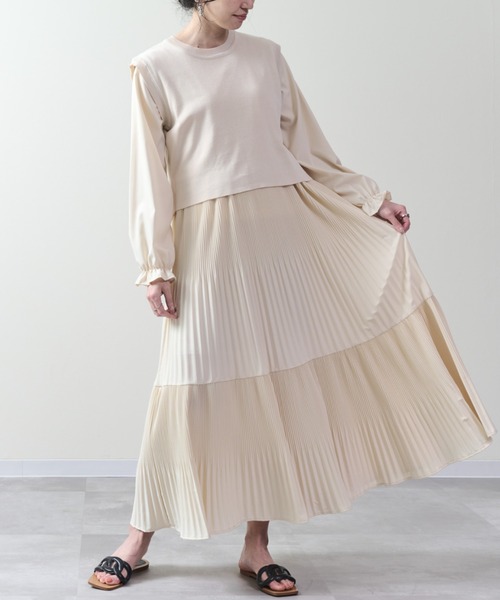 【Material】ワンピースには少し柔らかいシャツライクな生地を使用。ニットには弾力、キックバックのある生地を使用。【Design】ニットベストとワンピースをレイヤードしたようなデザインワンピース。ウエストから無数に入れたプリーツが動くたびに広がり、フレアラインのエレガンスをしっかり感じられます。背面のニットベストはざっくりと開いたデザインにリボンをあしらい、シルエット調整が可能。ベストはセパレート仕様のため、単品使いもでき着回し力が高いアイテムです。【Size】ニットは着丈の短いボックスシルエット。ワンピースはストレートに落ちながらもウエストのプリーツ部分からはフレアな形。【Styling point】ニットベストがセパレートで使えるので、着回し力が高くコスパも◎ワンピースはカーディガン・ジャケットを羽織るだけで雰囲気が変わり、季節を問わず楽しめます。____________________________★商品のお気に入り登録 完売カラーの再入荷通知や、ラスト1点の通知、セールの通知も受け取ることができます。是非ブランドの”お気に入り登録”もご一緒にお願い致します!!! ※画像の商品は光の反射や角度により、実物と色味が異なる場合がございます。 また、表示のサイズ感と実物は若干異なる場合もございますので、予めご了承ください。 ※着用、お取り扱いの際は、商品についている品質表示とアテンションタグを必ずご確認ください。-DOLLUPOOPS | ドールアップウップス-【Add a little essence】ライフスタイルの多様化が進む現代変わり続ける今をとらえ、自分らしい感性を大切にする女性に向けて" より美しく" 毎日を" 彩る" ワードローブを。日常に調和しつつ、" 普通 " に少しだけエッセンスをたして、他にない特別な一品を提案します。-Instagram-公式インスタグラム【dollupoops.tevalt_official】※商品のサイズ感やご質問は【dollupoops.tevalt_official】のインスタアカウントDMにて承っております。お気軽にご相談くださいませ。