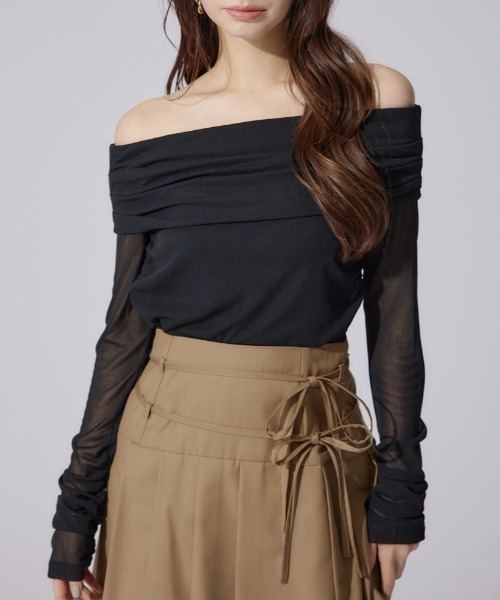 【シアーなオフショルデザインがオーラを放つ着心地の良いトップス】 ■ポイント シアー感のあるチュールをくしゅっと重ねたような胸元のオフショルデザインが、 いつものシンプルなスタイリングをドラマティックな表情に。 オフショルダー部分にタックを施し、さらっと着用しながらサマ見えするドレスライクなデザインが魅力です。 繊細な表情ながら、裏地にはストレッチ性のあるさらっと肌触りの良い素材を使用しているので、 安心してご着用いただけます。 生地のふんわりとした雰囲気が愛らしさもあるアイテムです。 ■ディティール 袖裾下にはギャザーを施し、袖にも立体感を出すことで華やかにしました。 裾には両サイドにドロストデザインを入れているので、好みの丈に調節できます。 ■スタイリング INでもOUTでも、好きなスタイリングで着こなすことができます。 ■生地 透け感:あり 裏 地:なし 伸縮性:あり 光沢感:なし 厚 さ:薄手 ■商品のお気に入り登録 お気に入りアイテムの再入荷・在庫1点などの通知を受け取ることができます。 [注意事項] ※画像の商品はサンプルです。実際の商品と仕様、加工が若干異なる場合があります。 ※画像の商品は光の照射や角度、お使いのモニター環境により、実物と色味が異なる場合がございます。 ※着用、お取り扱いの際は、アテンションタグをご確認ください。