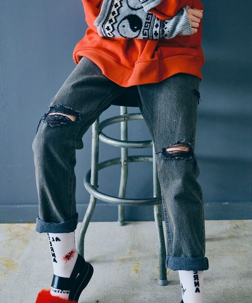 RNAらしいストリート感のあるダメージタイトストレート■POINT■膝に大きくあいたダメージと左脇のスラッシュダメージがRNAらしいデニムパンツ。少し裾を引きずるくらいの履き方がオススメです。腰回りはルーズなメンズライクなシルエットですが、腿や膝などはすっきりとしたストレートシルエット。そして裾に向かってテーパードしていないまっすぐなラインが、すっきりと大人っぽくなっています。膝下も長く見え、ストリート感も持ちつつ、すっきりと履けるおすすめのシルエットです。透け感:透けない伸縮性:なし裏地:なしポケット:ありウエストゴム:なし----------------------------------------------------------------------◆◆お気に入り登録しておすすめ情報をゲットしよう◆◆【商品のお気に入り登録】再入荷、残り1点、セール、タイムセール、クーポンなど、いち早く受け取ることができます。【ショップ・ブランドのお気に入り登録】新商品、予約商品、再入荷、ショップのおすすめトピックスなど、ショップ・ブランドの最新情報を受け取ることができます。----------------------------------------------------------------------※商品についている品質表示タグやアテンションタグを必ずご確認の上、着用、またはお取り扱い下さい。※画像の商品はサンプルです。実際の商品と仕様、加工、サイズが若干異なる場合がございます。※撮影場所により、光の当たり具合で色味が異なって見える場合がございます。商品写真はできる限り実物の色に近づけるようにしておりますが、実際の商品と色味が異なる場合がございます。カラーは商品の掛け画像をご参照下さい。