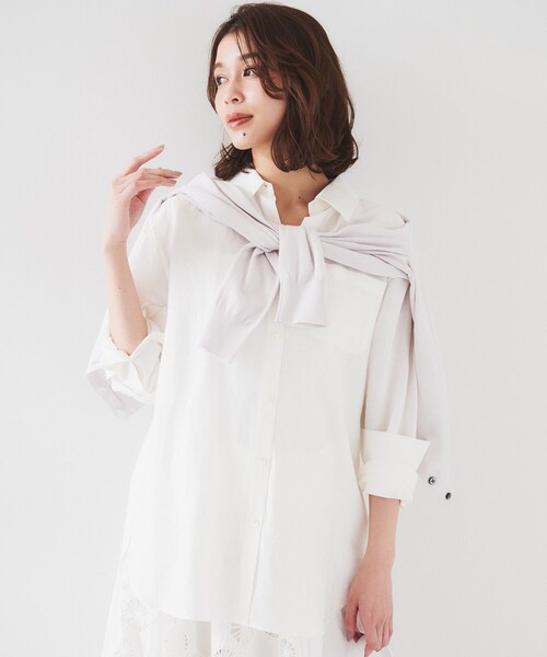 【デザイン】 羽織にもなるゆったりベーシックシャツ。 リネン混の張りのある素材感で、夏にぴったりなシャツになっています。 程よい分量のあるシャツは、後ろに抜いて着用して抜け感を出していただくのがおすすめ。 【素材感】 ここ最近のトレンドである薄くて且つハリ感のある、レーヨン、ナイロンの素材に麻をミックスさせた素材。 タテ糸に細番のナイロンを高密度に織り、ハリ感と艶感を出しているのが特徴。 プラス、ヨコ糸にはヴィスコース、リネンのスパン糸を使用する事で少しカジュアルさを持たせた、合繊と天然の間のようなちょうど良い質感を実現した素材です。 品のある艶感と控えめなリネンのスラブ感、適度なシアー感が特徴で、タテ糸のナイロンがインポートのような軋み感を表現し、良質感のある素材に仕上げています。 【着こなしポイント】 同素材の153-72512とのセットアップです。 単品としては153-62514とのコーデや、羽織ならインナーに153-12410を着用するのがおすすめです。 【仕様】 ・ポケット数:左胸×1 ※照明の関係により、実際よりも色味が違って見える場合があります。また、パソコン・スマートフォンなどの環境により、若干製品と画像のカラーが異なる場合もございます。 モデル情報:身長163cm B80 W59 H82 着用サイズ:02(M) 店舗へのお問い合わせ商品番号:153-82512 ●製品寸法: 00(XS):着丈68cm B116cm 袖丈51cm 肩幅44cm 01(S):着丈70cm B122cm 袖丈55cm 肩幅46cm 02(M):着丈71cm B126cm 袖丈55cm 肩幅48cm 03(L):着丈72cm B129cm 袖丈56cm 肩幅49cm 04(2LT):着丈73cm B132cm 袖丈57cm 肩幅50cm 44(3L):着丈74cm B140cm 袖丈54cm 肩幅53cm 48(5L):着丈76cm B148cm 袖丈55cm 肩幅55cm 50(6L):着丈77cm B152cm 袖丈55cm 肩幅56cm 備考: