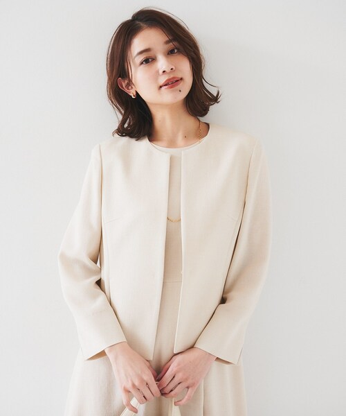 【デザイン】 女性らしいシルエットですが、シャープな印象を残すすっきりとしたデザインです。 フロントはスラッシュネックのように斜めにカットされており、 袖口はスリットになっていることで、折り返しがしやすくなっている点ポイントです。 【素材感】 トリアセテート高混率の麻調合繊。 トリアセテートとポリエステルの染着差によって麻のようなスラブ調、ナチュラル調の表情感が特徴の素材です。 さらっとドライタッチな風合いでシワになりにくく清涼感があり、春夏のおすすめ素材です。 【着こなしポイント】 ワンピースの羽織としておすすめです。 【仕様】 ・ポケット数:横×2 ・裏地なし ※照明の関係により、実際よりも色味が違って見える場合があります。また、パソコン・スマートフォンなどの環境により、若干製品と画像のカラーが異なる場合もございます。 モデル情報:身長161cm B79 W58 H86 着用サイズ:02(M) 店舗へのお問い合わせ商品番号:153-42508 ●製品寸法: 00(XS):着丈47cm B88cm 袖丈50cm 肩幅38cm 01(S):着丈49cm B91cm 袖丈52cm 肩幅39cm 02(M):着丈50cm B95cm 袖丈53cm 肩幅40cm 03(L):着丈51cm B98cm 袖丈54cm 肩幅40cm 04(2LT):着丈52cm B101cm 袖丈55cm 肩幅41cm 42(2L):着丈54cm B105cm 袖丈52cm 肩幅43cm 44(3L):着丈55cm B109cm 袖丈53cm 肩幅43cm 46(4L):着丈56cm B113cm 袖丈53cm 肩幅44cm 48(5L):着丈57cm B117cm 袖丈54cm 肩幅44cm 50(6L):着丈58cm B121cm 袖丈54cm 肩幅45cm 備考:重量:約255g(サンプルサイズ)