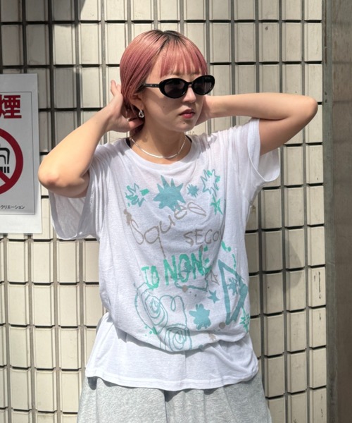 【25queeアイテム】 エッジの効いたイラストがプリントされたシアーTシャツ。 前面に手書きのようなイラストを施すことで、1枚でトレンド感があるスタイリングに★ カラーによって異なるデザインで、色違いで欲しくなるアイテムです。 程よい透け感があるシアー生地で抜け感があり、ストリートにもガーリーにも着こなせます。 ヒップにかかる着丈ですが、薄手の素材なので、アウトでの着用はもちろん、インスタイルもしやすいところが◎ トレンドのワイドボトムと合わせたスタイルやボトムレイヤードスタイルにもピッタリです。 サラッとした肌触りで、ストレスフリーな着心地です。 落ち感がある生地で、身体のラインを拾い過ぎず着膨れしにくいところが嬉しいポイント♪ 【25quee(トゥスクイー)】 JEANASISの限定ライン25queeがZOZOTOWNにオープン! ▼コンセプト 25quee(トゥスクイ―)は、自由なマインドと無限の個性を大切にしたブランド。 移り変わりの激しいトレンドを意識しながらも、 エッジの効いたアイテムで自分らしく昇華させ、唯一無二のスタイルを創造します。 今日はストリートに、明日は少しガーリーに、また別の日はラフに―― そんな自由でわがままな気分や日々のインスピレーションを尊重し、 "今の自分"を表現するファッションを提案します。 -INFORMATION- ◆商品のお気に入り登録 完売していても再入荷時に再入荷通知を受け取ることができますので、是非ご登録ください♪ ◆ブランドのお気に入り登録 新商品や再入荷などの情報を受け取ることができますので、是非ご登録ください♪ ※屋外の光や照明の当たり具合で、実際の商品の色味とカラー別画像の色味に違いが発生する場合がございます。 商品の色味はスタジオ撮影の詳細画像にてご確認ください。