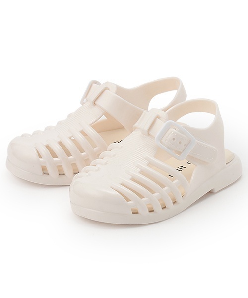暑い季節に大活躍するジェリーサンダルです。軽さが魅力のPVC素材を使用。ベルト部分は面ファスナー仕様になっており、お子さまも簡単に扱えます。無地4色、ラメクリア2色の計6色展開。クリアカラーには大きなハートモチーフをあしらいました。海や旅行など、アウトドアシーンのアイテムとしても重宝します。