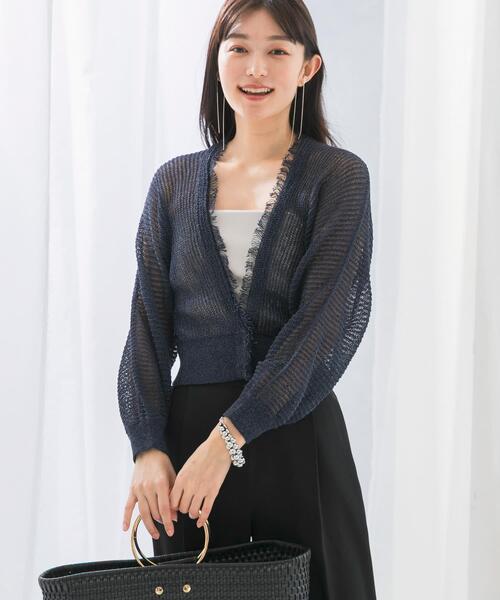 【衿ぐりにあしらったフリンジが魅力的な、柄編みカーディガン】 さっと羽織れて着映えする、デザインカーディガンが新登場。フリンジ編みの特徴的な風合いで、軽さのある編地感はリラクシーな着心地です。深めのVネック仕様のため、お顔周りをすっきりと演出。ドルマンスリーブは抜け感たっぷりの一着となります。ショート丈で設計することで、幅広いボトムやワンピースと好相性の一着に。 【2025 Spring/Summer】【25SS】 ※この商品は、部分的に切りっぱなしになっている箇所があります。着用、クリーニングで多少のほつれが生じますのでご了承ください。 ※レーヨンは濡れると縮みますが、伸ばしながらアイロンをかけると元に戻る性質があります。洗濯後は形を整え、タテ・ヨコ伸ばして干してください。 ※その他お取り扱いに関しましては、商品に付属のアテンションタグをご覧ください。 総重量 : 約220g ※商品画像は、光の当たり具合やパソコンなどの閲覧環境により、実際の色味と異なって見える場合がございます。予めご了承ください。 ※商品の色味の目安は、商品単体の画像をご参照ください。 ▼お気に入り登録のおすすめ▼ お気に入り登録商品は、マイページにて現在の価格情報や在庫状況の確認が可能です。 お買い物リストの管理に是非ご利用下さい。 素材感 透け感 : あり 伸縮性 : あり 裏地 : なし 光沢 : なし ポケット : なし FREE