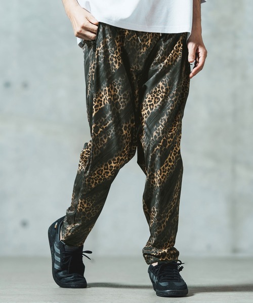 175cm B90-W73-H89 靴26.5cmのモデルがMサイズを着用。オリジナルテキスタイルを用いたイージートラックパンツ。エッジの効いたデザインが存在感のあるコーディネートを演出する1着です。GLIMCLAPのアイコン的なテキスタイルであるレオパードを個性的にアレンジしたオリジナルテキスタイル。ムラがあるようにレオパードパターンを描いた独特な世界観を感じる柄行きです。軽くて柔らかい質感のポリエステルのファブリックです。総柄プリントは、昇華転写という特殊転写プリント技法を使用しており、キレイな仕上がりです。股上寸法を定番的な設定より少し長めに設定したソフトなサルエル感覚と、膝辺りから細めに仕上げたテーパードラインをミックスした丸みのある個性的なシルエットです。丸みのあるシルエットをナチュラルなものにするフロントの2タックデザイン。裾口にドローコード&ストッパーを内蔵し、シルエット調節が可能。ウエストは、平ゴムとスピンドルを配したイージー仕様。※着用画像と商品単体画像で色が異なる場合がございます。※商品単体画像を実物により近づけております。