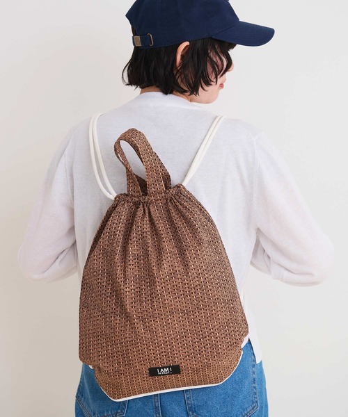 <BASKET print> サンドイッチやフレッシュなフルーツが入っていそうな バスケットをイメージして作ったオリジナルテキスタイル。 バスケット柄がユニークなナップサック。 カジュアルすぎないようフェイクレザーのひもをポイントにしました。 リュックほど厚みがなくちょうどいい大きさのナップザックは おでかけや普段使いにぴったりです。 カラー展開:ブラウン/ブルー BASKETシリーズ ・キャミブラウス(9501BL010251) ・ナップサック(9501BG004251) ・パンツ(9501PT009251) ※着用商品はサンプルです。実際の商品と仕様、加工、サイズが若干異なる場合がございます。 ※光の関係で実物の商品の色味とは若干異なる場合がございます。 実際に近い色味は詳細画像をご参照下さい。 ※取り扱いの注意については取り扱い表示をよくご確認の上、着用をお願いいたします。 【素材の特性、お取り扱いの注意】 ・重いものを入れると破損する恐れがあります。ご使用の際はご注意ください。 ・この製品は付属に合皮を使用しております。水に濡れた場合や摩擦等により、色落ちする可能性がありますが、御了承お願いします。変色の恐れがある為、直射日光や蛍光灯等の当たらない場所で保管お願い致します。 ・(プリント製品)この製品は特殊加工品です。永久的なものではなく、もまれたり、擦られたりすると脱落しやすく、また、水洗いをくり返すことにより多少薄くなります。取扱いの際は次の点に十分ご注意下さい。水洗いの際は、取扱い絵表示を確認の上お願いします。 IAMI IN FACT... アイアムアイインファクト わたしはわたし 1年のうちすこしだけおとこのになれたらいいのに でもふと思い出すフリルやピンクにあこがれた 小さいころのじぶん いくつになっても消えることのない 少年少女の心を大切に チャーミングボーイ ドリーミーガール