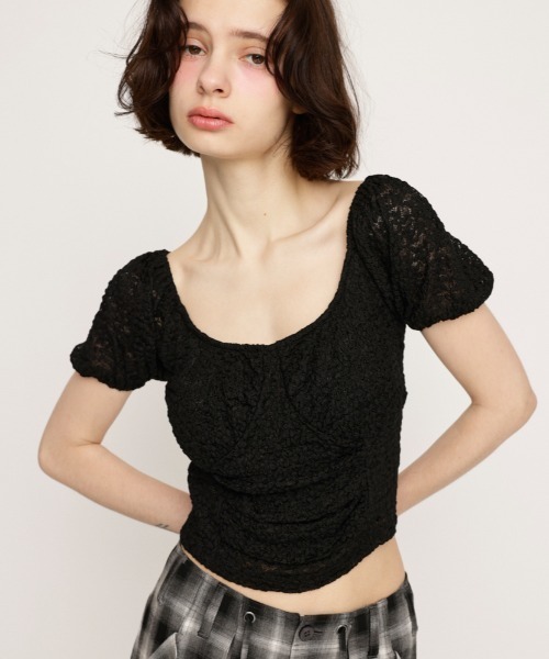■POINT:パフスリーブデザインが可愛いトレンドのレースカットトップス。着るだけでコーデが一気に華やかになるアイテムです。■DETAIL:程よいボリューム感のパフスリーブとUネックの襟元が顔周りをスッキリ見せてくれます。裾に向かって細くなるシルエットなので、ウエスト周りもすっきりみえるのも嬉しいポイント。■STYLING:ガーリーな印象のトップスなので、デニムやハーフパンツなどのカジュアルなアイテムを合わせて頂くのが今季のSLYらしいスタイリングでおすすめです。涼しい時期は、レザージャケットなど強めのアイテムと合わせるのが一押し。■FABRIC/MATERIAL:程よく伸縮性のあるレース素材を使用しています。■透け感:あり■光沢感:なし■伸縮性:あり■裏 地:あり[注意事項]※画像の商品はサンプルです。実際の商品と仕様、加工が若干異なる場合があります。※画像の商品は光の照射や角度、お使いのモニター環境により、実物と色味が異なる場合がございます。※着用、お取り扱いの際は、アテンションタグをご確認ください。※一部予約商品につきましては生産上の都合によりお届け予定日や店頭発売と前後する場合もございます。※追加生産商品は、一部の店舗、通販で販売中の場合がございます。予めご了承下さい。【SLY/スライ】「Casual」「Girly」「Mode」をベースに発信する、ディテールへのこだわりが詰まった、どこか必ず女性らしさを感じるアーバンスタイル。 さまざまなエッセンスをミックスした、時代の空気を体現するコレクションを展開。 ▼商品のお気に入り登録 お気に入りアイテムの値下げ・再入荷・在庫5点などの通知を受け取ることができます。 ▼ブランドのお気に入り 登録新商品や再入荷、セール、クーポン配布などお得な情報を受け取ることができます。※こちらの商品はSLY独自の採寸方法となっています。本サイトのサイズガイドと採寸方法が異なる場合がありますのでご了承ください。