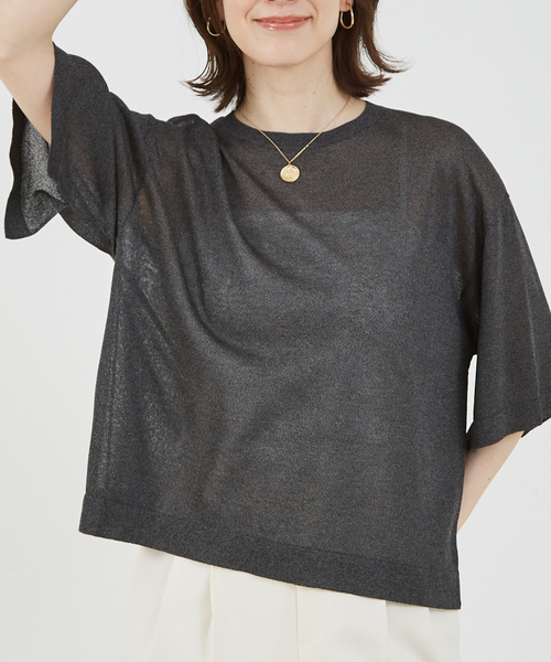 上品さが嬉しい大人シアートップス 【Design】 程よい光沢で大人っぽく仕立てたシアーニットTシャツ。シンプルなデザインなのでオンオフ問わず幅広いシーンで活躍します。さりげなく抜け感を演出する袖下のスリットもポイント。ゆったりとしたサイズ感で着心地も抜群な1着です。 【Fabric】 上品な光沢のある糸で繊細な透け感のあるシアーの編地ニット。涼しいドライタッチ素材です。 【Styling】 思いっきりカジュアルなボトムにも相性よく、上品な大人カジュアルに仕上げてくれます。ジャケットのインすればオフィスシーンにも◎。 シアートップス/シアーニット/サマーニット/5分袖/スリット/シアー/透け感/リネンライク/夏ニット/大人ニット/クルーネック/通勤/大人カジュアル/キレイ目/アイボリー/ベージュ/チャコールグレー/ピンク/夏物 ********************** 透け感:あり 裏地:なし 伸縮性:あり 光沢感:なし 生地の厚さ:やや薄手 **********************