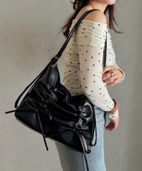 【efill / エフィル】★大人気の一押しアイテムが登場!★ 「ラグジュアリーな日常を演出する、リボンディテールバッグ。」 ラグジュアリー感のあるブラックカラーが印象的フェイクレザーバッグ。 特徴的なリボンディテールがアクセントとなり、シンプルながらも洗練されたデザインに仕上がっています。 持ち手が長めで、肩掛けもできるので使い勝手も抜群。カジュアルからフォーマルまで幅広いコーディネートに合わせやすいアイテムです。 ■Point・リボンディテールがデザインのポイントになり、シンプルな中にも個性をプラス・長めの持ち手で肩掛けも可能、使い勝手抜群・上品なブラックカラーがどんなスタイルにもマッチ・シンプルでありながらラグジュアリー感が漂うデザイン ■Fabric…………………… ・PC収納:○ ・A4対応(22×31cm):○ ・長財布(10×20cm):○ ・二つ折り財布:○ ・キーケース:〇 ・ペットボトル横向き(500ml):○ ・ペットボトル縦向き(500ml):× …………………… 【efill】 1日のうちに触れる洋服やアクセサリー。ライフスタイルに合わせコーディネートを考え、1日をスタートさせると思います。 [e]very(毎日)[f]ill(満たす)efill.を通してファッションから毎日の幸せ・ワクワクする楽しさ・パワー、刺激を共有していきたいです。 efill.は「誰もが着れる締麗め大人アイテム・デートにも着て行けるプチプラアイテム]をお届けします。 ■Instagram【@hono_21_ @efill_official】 Instagramにて新作情報更新中 ここには載っていない写真も掲載しているのでぜひチェックしてみてください! ■Coordinate カジュアルコーディネート:ジーンズやワンピースに合わせて、カジュアルに決めて。 フォーマルコーディネート:ドレッシーなコーディネートにもぴったり、上品さをプラス。 モードコーディネート:シンプルなシルエットのコーディネートにアクセントとして取り入れて。 ※ご覧のモニター環境により、画像の色味と多少異なる場合がございます。 ★お買いものをよりお楽しみいただく為に!★ ■お気に入り登録 [♥マーク] を押すと登録完了! お気に入りアイテムの値下げ・完売カラーの再入荷・在庫1点などの通知を受け取ることができます。 ・ブランドのお気に入り登録 新商品や再入荷など、いち早くブランドのお得な情報を受け取ることができます。 -ブランドの最新情報はinstagram【@efill_official】でご確認いただけます! ※他のキャンペーンにより、期間中に価格が変動する場合があります。※セールは予告なく終了させていただく場合もあります。