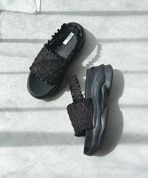 たっぷりのギャザーフリルが夏のコーディネートに華やかさをプラスする厚底スポーツサンダル。 深めの甲ベルトは裏に当て生地があるのでしっかり足にフィットしてくれて安定感抜群。 かかとはゴム仕様なので片手でスッと履けるのも嬉しいポイント。 低反発のふかふかインソールで長時間の使用にもストレスを感じにくい履き心地です。 参照サイズ S:22-22.5cm M:23-23.5cm L:24-24.5cm LL:25-25.5cm ※撮影場所や明るさにより 実際の商品と色味が若干異なる場合がございます。 ☆商品のお気に入り♡登録を押せば ”再入荷通知”や”残りわずか通知” 値下げのお知らせが届きます! お気に入りのブランド登録していただければ新商品入荷のお知らせも届きますので 是非登録してみて下さい