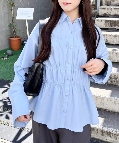 【一枚で大人カジュアルに決まるこなれ感シャツ】 ▼Design ビスチェ風のシャーリングを施したトレンドデザインシャツ シャーリングで表現したコルセットデザインがシルエットにメリハリをつけ、細見えが叶う一着。 シャツ一枚で様になり着映え抜群です。 袖口は程よいワイドシルエットで抜け感がでてカジュアルにまとまります◎ シンプルなワンカラーから、清潔感のあるストライプ柄まで、豊富なカラー展開。 ▼Styling タイトなスカートやデニムパンツなど、ぴったりしたシルエットのボトムス合わせがおすすめ。 デニムと合わせたベーシックカジュアルから、スラックスと合わせたきれいめコーデまで、幅広くコーディネイトできます。 【以下ブルー/ストライプ参考。カラーにより多少の誤差あり】 ・透け感:やや透ける ・伸縮性:なし ・生地の厚さ:普通 ・裏地:なし ▼Recommend ・ビスチェ ・シャツ ・シャーリング ・春シャツ