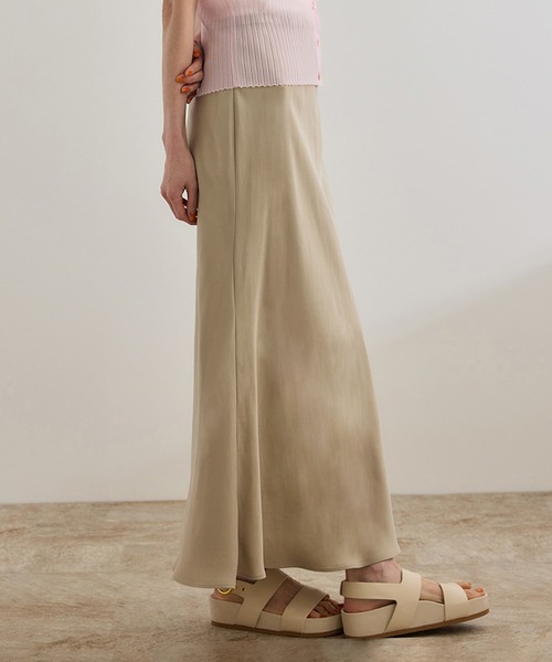 定番ポケット付きスカートに次ぐ人気!しなやかな光沢と美シルエットが魅力のバイアスマーメイドー Effortless Elegance ー(エフォートレス エレガンス)「忙しい毎日にちょうどいい。ラクしておしゃれが叶う服」気負わず、気張りすぎないけれど、女性らしさのあるアイテムのラインアップ。ON/OFF問わず着まわせて、お手入れも簡単なイージーケアアイテムで、毎日のおしゃれをもっと快適に。【デザイン・シルエット】スタイルアップして見え、身体のラインがキレイに見える、ロング丈のバイアスマーメイドスカート【おすすめのスタイリング】シアーニットを合わせ、上から同素材のノーカラージャケットとセットアップがお勧めです。インナーをTシャツにしてカジュアルダウンさせるのもわかり易くお勧めです。【素材】程良い手持ち感のある厚さと接触冷感がありながら、微起毛感のあるフィブリルサテン----------------------------透け感:なし裏地:なし伸縮性:あり光沢感:ややあり生地の厚さ:中肉ポケット:なし開き方:開きなし、ウエストゴム----------------------------【モデル情報】モデル身長:171cm 着用サイズ:38【フィブリルサテン シリーズ】同素材でデザイン違いのフィブリルサテンノーカラージャケット(品番: GGV75010)フィブリルサテンマーメイドスカート(品番:GGC75010)がございます。※画像の商品はサンプルです。実際の商品と仕様、加工、サイズが異なる場合がございます。※撮影場所やライティング、お使いのモニター環境によって色の見え方が異なる場合がございます。※商品のカラーは画像の色味をご参照ください。動画は仕様説明のため、色味が実物と異なる場合がございます。