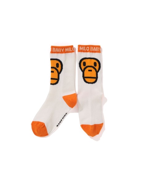 ジャガード織りの生地を使用したキッズ用のクルー丈靴下。リブ部分にBABY MILOロゴ、フロント部分にMILO FACEのデザインが施されており、細部までこだわったアイテム。