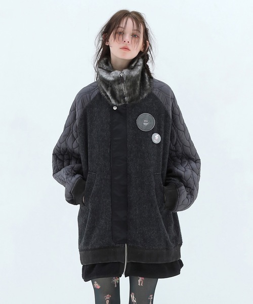 BEDSIDEDRAMA 2025-26AW "Primitive Era" 上質なウールブルゾンの袖にイタリア産の縄柄キルティング、首元にリアルなエコファーを組み合わせたボリューム感のあるゴージャスなシルエットが魅力的なブルゾンです。 軽く暖かくアウターとしての基本スペックを満たしながら、遊び心溢れるディテールが満載されており、大人の女性も似合う25AWの一押しアウターです。 オリジナルの缶バッジが胸元に2個付属いたします。 ANLIO OFFICIAL、ZOZOTOWN にて在庫発売 ANLIO OFFICIAL→会員10%割引、 ZOZOTOWN →paypay、ZOZOポイント 各ショップによりサービス内容が異なります BEDSIDEDRAMA 2025-26AW "Primitive Era" 太古の時代に想いを馳せたコレクションを展開。世界でも珍しい縄目の文様の土器を使用していた縄文時代。 現代とは違うベクトルの世界から出土した架空の土偶を総柄で描いたプリントや、新しく描いた縄文様やシルエットを展開 コーデュロイ素材の生地方向を組み合わせた複雑な模様や、ハンドクラフト感のある手編みニットを組み合わせたアイテムも印象的。 人類の起源ともいえるアダム&イヴや、誰もが知っているキャラクターモチーフのユニークなプリントにも目を奪われます。 自然と共存した時代。産時の環境へのダメージを軽減し、つくられるBRING OUT ECO+を用いたりと、 デザイン、素材ともに太鼓の時代に寄り添ったコレクションに仕上げました。