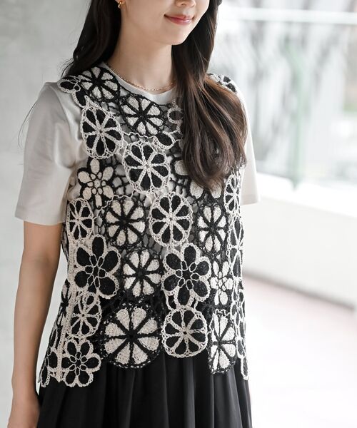 インパクト抜群のクロシェ編みレースベスト 2色の糸を使ったクロシェ編みベスト。 大きなお花のモチーフがコーデにインパクトを加えます。 1枚でもレイヤードでも使えるアイテム。 プラスワンでスタイリングが盛り上がること間違いなしのトップスです。 ※再入荷の場合、生産時期が異なるため色・素材・サイズ・デザイン等多少異なる場合がございますので予めご了承ください 裏地なし 伸縮性なし 薄手 洗濯:手洗い可 ▼お気に入り登録でお得がいっぱい▼ ~商品をお気に入り登録~ 再入荷・ラスト1点などの通知を受け取ることができます! ~ブランドをお気に入り登録~ 《rps》の新商品・再入荷情報をいち早くお届け!
