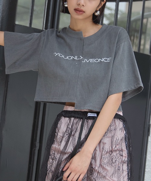◆リメイク風のアレンジをほどこしたデザインTシャツ◆【Design】1枚のTシャツをセンターでカットしてリメイクしたようなデザインTシャツ。素材感はピグメント加工風のカットソーを使用することで、トレンドの古着っぽさを表現しました。こなれた印象に見えるよう、ロゴのひび割れデザインにもこだわりモードな雰囲気に。身幅にゆとりを持たせたボックスシルエットなので窮屈感なく着用いただけるのもポイントです。【Styling】クロップド丈なのでハイウエストボトムやワイドパンツとの相性がよく、上半身をコンパクトに見せてくれるTシャツ◎一癖あるデザインTシャツなのでシンプルなスタイリングに合わせるだけでもこなれた印象に見せてくれます。カジュアルながらも洒落た雰囲気のスタイリングにしたいときにおすすめなTシャツです。【おすすめ骨格タイプ】▪骨格ウェーブ▪骨格ナチュラル身幅にゆとりがあるシルエットなので、骨格ストレートさんでも着こなしやすいデザイン。ボトムにはハイウエストなものや、ストレートシルエットのものを合わせるとバランスよく着こなして頂けます◎※ピグメント加工風の素材を使用しているため色味・ムラに個体差がございます。予めご了承くださいませ。サイズ補足着丈(左右):40.5/38㎝身幅:48㎝ 肩幅:44㎝ 袖丈:20㎝裾幅:48㎝・・・・・・・・・・・・・・・・・・・・・・透け感:無し裏地:無し伸縮性:有り光沢感:無し生地の厚さ:普通・・・・・・・・・・・・・・・・・・・・・・▼商品のお気に入り登録お気に入りアイテムの値下げ・再入荷・在庫1点などの通知を受け取ることができます。▼ブランドのお気に入り登録新商品や再入荷、セール、クーポン配布などお得な情報を受け取ることができます。※画像の商品はサンプルです。実際の商品と仕様・加工・サイズが若干異なる場合がございます。予めご了承くださいませ。※撮影場所やお使いのモニター環境により若干お色味が異なる場合がございます。※製品によっては染料の特性上、湿った状態や汗をかいた状態での長時間の放置、または摩擦により、他のものへ色移りする恐れがありますので、着用時にはご注意下さい。 ※風通しがよく、湿気の少ない日の当たらない場所で保管して下さい。 ※また製品加工上、お手元に届く際に匂いが生じる場合がありますが、 ご使用を続けていく事により匂いは軽減されます。