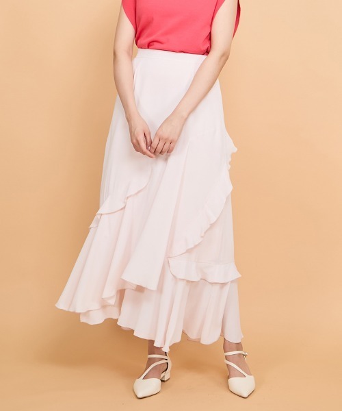 ーバイアスなラッフルデザインがスタイルアップの秘訣ー ●POINT アシンメトリーでバイアスに施されたラッフルのレイヤードデザインが春風になびく軽やかな動きを演出するフレアスカートです。 水平に配置されるラッフルデザインと比べて、斜め縦方向へのフリュイドなラインになり、膨らみがちなラインをすっきり見せます。 バックゴム、サイドファスナー仕様になっています。 ●FABRIC ソフトで軽やかなムースのようなテクスチャーでシワが目立ちにくいイージーケアテキスタイルを使用しています。 ---------------------------------- 透け感:淡色のみややあり 厚さ: 薄い 伸縮性:なし 裏地: あり ポケット: なし ---------------------------------- ---------------------------------- 洗濯方法 家庭洗濯:液温は40℃を限度とし、手洗いが出来る。 自然乾燥:日蔭の吊り干しがよい。 アイロン:底面温度110℃を限度としてアイロン仕上げができる。 ドライクリーニング:石油系溶剤による弱いドライクリーニングができる。 ---------------------------------- ■モデル身長 163cm/着用サイズ M ※画像の商品はサンプルとなりますので実際の商品と仕様、加工、サイズが若干異なる場合がございます。 ※お客様のモニター環境により実際のお色と多少異なる場合がございます。 ※撮影状況や光の当たり具合により、色合いが異なって見える場合がございます。