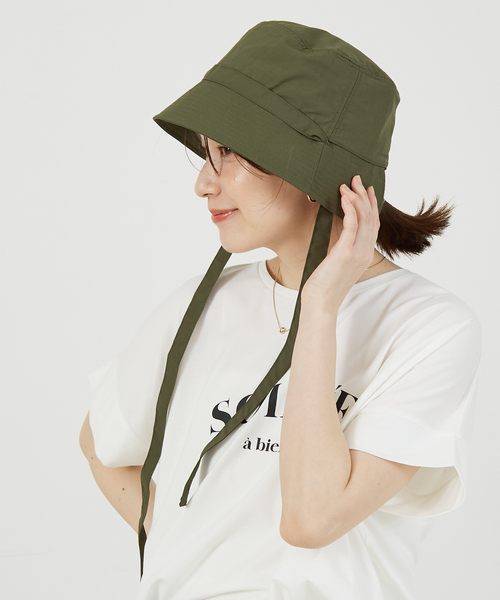 ヘッドウェアは実用性重視の方に新鮮なデザイン!【Design】機能素材のリボン付きバケットハット。結んだ髪を出す事が出来るブリムの新鮮なデザイン。撥水コーティング仕様で雨の日や梅雨の時期の野外活動にもおすすめのアイテム。【Fabric】UPF50+で接触冷感裏地を使用。撥水加工で軽い突然の雨などにも安心です。【Styling】リボンは取り外し可能なので結ぶ位置を変えたり、縛った髪に結んでも◎シンプルコーデにはそのまま垂らしてコーデの一部として楽しんでもらうのもおすすめです。