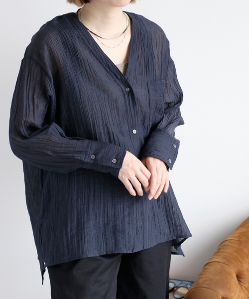 ナイロンをブレンドしワッシャー感を出したVネックのシャツブラウス。ほどよい透け感でヘルシーな大人の肌見せスタイル♪◇Point◇シアー感のある生地にワッシャー加工(風合いのあるシワ加工)を施したVネックのシャツブラウス。微光沢の素材で大人っぽくこなせつつ、ワッシャーの表面感できれいになり過ぎず、カジュアルなものとも相性の良い羽織りです。フロント・バックともに襟をVネックにしており、自然でヘルシーな肌見せコーデに最適な1枚。デコルテ部分が美しく見えます!着丈は前後の長さを変えたアシンメトリーなデザイン。フロントだけインして着るスタイルもおすすめ◎。さらに袖はロングカフスに仕立て、ボリュームスリーブとのコントラストがメリハリのあるシルエットを生み出します。とても軽く涼しい素材なので盛夏の季節でも活躍間違いなし!カーディガン感覚で気軽に羽織れるシャツブラウスです。◇Material◇シアー感のあるセルロース生地にナイロン素材をブレンドし、さらにワッシャー加工を施しています。洗いざらしのような風合いのあるシワ加工と、柔らかい生地感が特徴です。気軽にお洗濯できるのも嬉しいポイントです。ややオーバーサイズなシルエットで、インに長袖Yシャツを着ても窮屈になりません。サイドは抜け感を作り出すスリット入り。◇Coordinate◇カーディガン感覚でさらっと羽織れるシャツブラウス。透け感があるのでインにカジュアルロゴTシャツを着るのもおすすめ。シンプルに合わせるならタンクトップやキャミソールが◎。シアータートルで合わせるとより上品な印象になります。Tシャツ1枚で物足りない時にさっと羽織って上品に見せる、着回し力のある夏のブラウスです♪※照明や天候により実際の色味と異なって見える場合がございます。ご了承くださいませ。【キーワード】#Y2K#20代#30代#40代#50代