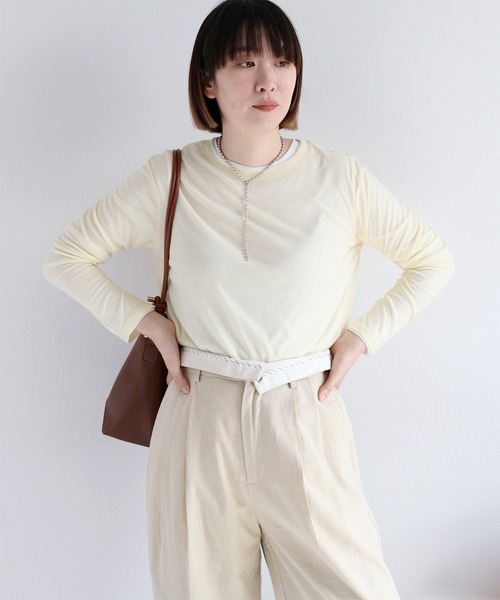 春夏秋の着回しに使いやすいシアーカットソー。肌に優しく軽い着心地でインナー使いにも最適な1枚♪◇Point◇程よい透け感のあるシアーカットソー。とろみのある生地を使用し、とてもやさしい肌触りです。袖にスリットを入れ絶妙なフレア感に仕立てています。シルクをプラスすることで滑らかなとろみ感を表現。やや光沢があるので1枚で高見えするアイテムです。1枚着としても着回しできますが、ニットやスウェットの下に着て手元の差し色コーデに使えます!◇Material◇ポリエステル×レーヨンの生地にシルクをプラス。絶妙な透け感で肌触りもよく、伸縮性のある生地なのでコンパクトな作りながら程よくフィット◎キャミソール、タンクトップの上から着れば1枚着としても活躍します。着丈はミドル丈でインでもアウトでも使えます。◇Coordinate◇メインとして着るならカジュアルにデニムやカーゴパンツといったボーイッシュなアイテムと合わせるとイマドキのバランスが取れたコーデが実現。Tシャツやブラウス、シャツとにレイヤードするスタイルも◎ビジネスではスーツのインナーとしても使えます。ニットやスウェットのインに着て、袖フレアをチラっとのぞかせても様になる万能アイテムです。※照明や天候により実際の色味と異なって見える場合がございます。ご了承くださいませ。【キーワード】#Y2K#20代#30代#40代#50代#結婚式二次会#オフィスカジュアル