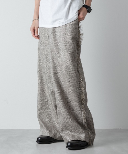 バルキーツイードの素材感が圧倒的なワイドパンツです。サイドはフリンジ状の素材をほつれさせワイルドな粗野感を演出しています。立体裁断で精査されたボディーは履き易く存在感があります。 素材 バルキーなヴィスコースを使用したバスケットツイードです。後染めで白黒杢調に表現しており、糸加工によるドライな風合いと、ヴィスコースの微光沢感がマッチしている素材です。 ato - アトウでは身体を個性の象徴と捉え、一つ一つのパターンにこだわりを持ち服作りに取り組んでおります。 全てのアイテムを立体裁断で作っているのも、フォルムはデザインであり、また身体という個性を意識させるシルエットを目指しているからです。男性らしさ、女性らしさに捉われて一本のラインを引くことなく、「個々の個性を引き出す」という考えのもと物作りを行っております。 また、アトウでは服の全てにパタンナーネームをつけております。これはデザイナーだけではなくパタンナーなどスタッフ一人一人が「良い服を作る」という目的のもと、個性を生かした服作りを行っている象徴でもあります。