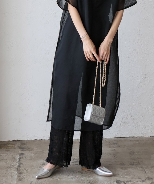 【デザイン】 レイヤード風シアーチュールパンツ 透け感のあるチュール素材を使用したシアーパンツです。 コレ一枚でも、レイヤードスタイルでも、着用するだけでトレンドムードを醸し出してくれるパンツ。 短丈の同色の裏地付きのレイヤード風なデザインなので、安心して着用いただけます◎ ウエストはゴム仕様で、ノンストレスなリラックスした着用が叶います。 レースとも思わせるチュール素材が、涼しげで軽やかな印象。 ヘルシーな肌見せが叶います♡ スタイリングはワンピースに重ね着レイヤードコーデや、 トップスをロングシャツや、ショート丈シャツを持ってくると、スタイリッシュでモードな印象に。 ジャケットを羽織れば、オフィスカジュアルなコーデもできる、トレンド感とマルチさを兼ね備えたアイテム。 トップスに長さのあるものを合わせるスタイリングがコーデがオススメです♪ ※末永くご愛用いただく為にアテンションタグを必ずご確認の上、お取り扱いとご着用をお願いいたします。 ※ニット素材となります為、長さ・幅に伸縮が出ることがあり若干の個体差がございます。 ※照明の関係により、実際よりも色味が違って見える場合があります。 またパソコン・スマートフォンなどの環境により、 若干製品と画像のカラーが異なる場合もございます。予めご了承ください。 【サイズ等】 サイズ:FREE 総丈:92cm 股上:33cm 股下:62cm ウエスト(平置き×2):64cm ヒップ(平置き×2):94cm わたり幅:29cm 裾幅:24.5cm 重量:210g 素材:表地ナイロン92%ポリウレタン8% 裏地ポリエステル100% …………………… 伸縮性:あり 裏地:あり 透け感:あり 生地の厚さ:薄い ポケット:なし …………………… 【お取り扱い上の御注意】 ・繊維および染料の性質上、汗や水で濡れますと色落ちすることがあります。 ・水を含むと縮みやすい為、長時間水の浸漬や浸置はさけ、選択後は直ちに整形し干してください。 ・漂白剤や蛍光剤の入った洗剤は使用しないでください。 ・家庭洗濯時タンブル乾燥はお避け下さい [カラー] ブラック・チャコール・アイボリー モデル身長:164cm/着用サイズ:FREE ◆商品のお気に入り登録◆ 完売カラーの再入荷通知や、ラスト1点の通知、 セールの通知も受け取ることができますので、是非ご登録ください。 ◆ブランドのお気に入り登録◆ 新商品や再入荷などの情報を受け取ることができますので、是非ご登録ください。