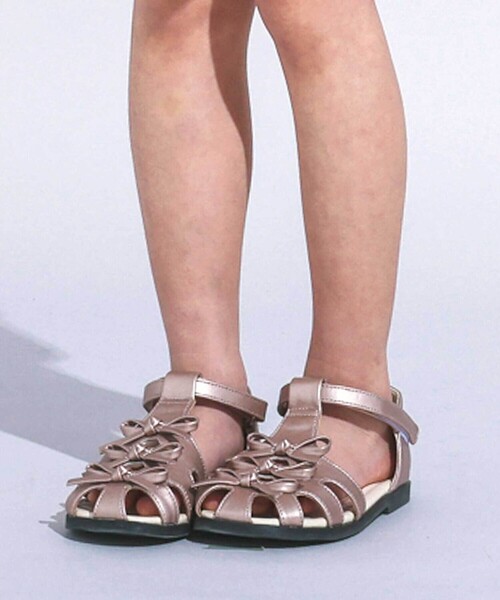 アッパーにたくさん並んだリボンのモチーフがかわいい女の子用サンダル。 つま先まで包んでくれるメッシュタイプのアッパー+かかとありのTストラップでお子様の足をしっかりとホールドしてくれます。 ストラップはマジックテープで止めるタイプなので脱ぎ履きしやすい仕様。 メタリックなシャンパンゴールド(ベージュ)とシルバー(グレー)の2色展開です。 つま先にきちんと反り返りのある合成底とクッション性のある中底を合わせて履き心地にもこだわりました。 デニムなど合わせたカジュアルスタイルからワンピースと合わせたリゾートスタイルまで、幅広いシーンでお使いいただけます。 素足はもちろんソックスと組み合わせた着こなしもおすすめです。 【2025年春夏 シーズンテーマ】 -風のように- 青空に吹く 心地よい風。 そんな風のように 軽やかに背中を押してくれるファッション。 風に乗って 知らない世界を発見しに行こう。 【BeBe(べべ)】 ”LOVE MODERN” 少しおませで、生意気なヨーロピアンカジュアルの提案。 時代性・流行性をとらえ、ベーシックでもワンポイントを施した遊び心、楽しさを盛り込んでいます。 シンプルだけど、こだわりのあるオリジナリティーを重視しています。 2025年 春夏 女の子アイテム