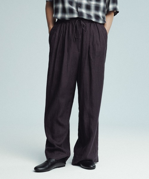 軽やかなリネン素材と3タックデザインが織りなす、綺麗なシルエット。 迫力のあるシルエットはスタイリングに映える一本に仕上がっています。 【素材】 洗いざらしのシワの風合いが着こなしに映えるリネンオックス素材。 程良く厚みのある40番手のリネンを使用しており、麻特有の凹凸ある表情がありながらも快適な着心地を実現しています。 生地は染色後に優しく叩きほぐす加工入れているので、ソフトでふっくらとした洗い晒しの風合いに仕上げております。 色は『ナス紺』『黒』『カーキ』の3色展開。 【デザイン・シルエット】 フロントに3タックを入れたリラックスした着心地とストンと落ちる綺麗なシルエットを両立したワイドイージーパンツです。 ウエストはスピンドルのイージー仕様で腰回りにゆとりのあるフォルムとなります。 ワイドシルエットな分、足さばきも軽快で肌離れも非常に良い為、夏でも快適に着用していただけます。 また、肌との距離を取っている為、シワになりにくいのも嬉しいポイントです。 【おすすめスタイリング】 同素材で展開しているジャケットとのセットアップでの着用はもちろん、セパレートでも様々なスタイリングをお楽しみいただけます。 これからの時季は素材感の異なるシャツなどコーディネートしたスタイリング。 盛夏にはTシャツをタックインしてレザーサンダルでまとめた程良く肩の力を抜いたコーディネートもおすすめです。 Tシャツやシャツなど、トップスや足元もアレンジしていただける汎用性に優れたアイテムに仕上がっています。 同素材で展開しているジャケットはこちら 【モデル着用情報】 短髪:Height:180cm Bust:92cm Waist:76cm Hip:90cm Lサイズ着用 長髪:Height:184cm Bust:83cm Waist:70cm Hip:91cm Lサイズ着用 【推奨サイズ】 サイズM:身長~175cm サイズL:身長176cm~ ※標準体型を基にした目安になります。 ----------------------- 裏地:なし 光沢感:なし 透け感:なし ポケット:あり 伸縮性:ややあり 生地の厚さ:普通 -----------------------