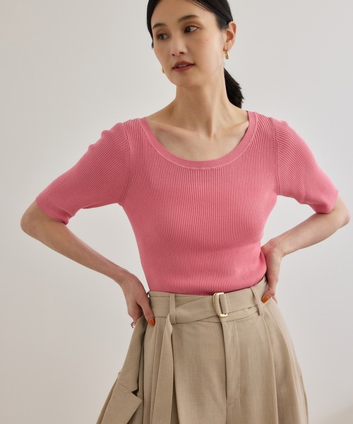前後2WAYで着回し自在、フィット感が心地よいベーシック五分袖リブニットー Effortless Elegance ー(エフォートレス エレガンス)「忙しい毎日にちょうどいい。ラクしておしゃれが叶う服」気負わず、気張りすぎないけれど、女性らしさのあるアイテムのラインアップ。ON/OFF問わず着まわせて、お手入れも簡単なイージーケアアイテムで、毎日のおしゃれをもっと快適に。【デザイン・シルエット】程良いフィット感のリブ編みで前後2WAY使用できる五分袖ニットです。鎖骨がキレイに見えるラウンドネックになります。【おすすめのスタイリング】ジャケットやジレのインナー使いにでき、1枚着としてもTシャツのように使え、汎用性のあるアイテムとなっています。【素材】14ゲージの強撚コットン、エコベロレーヨンのベーシックなリブ地です。----------------------------透け感:なし裏地:なし伸縮性:あり光沢感:なし生地の厚さ:中肉ポケット:なし開き方:かぶり----------------------------【モデル情報】モデル身長:171cm 着用サイズ:F※画像の商品はサンプルです。実際の商品と仕様、加工、サイズが異なる場合がございます。※撮影場所やライティング、お使いのモニター環境によって色の見え方が異なる場合がございます。※商品のカラーは画像の色味をご参照ください。動画は仕様説明のため、色味が実物と異なる場合がございます。