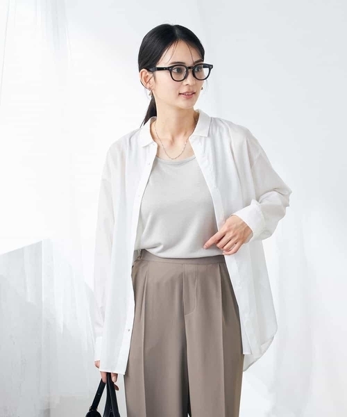 ◆多機能素材が嬉しいシアーシャツ◆ 【デザイン】 ・人気のバックタックシアーシャツが今年も登場! ・しわになりにくい、程よい透け感の素材にブラッシュアップ ・フロントはシンプルなデザインで使いやすいです ・腰回りが隠れる着丈で体型カバーも◎ ・カフスはゴム入りでタックアップしやすいです ・夏の冷房対策にもおすすめ ・カラーバリエーション豊富で様々なシーンで活躍します 【素材】 ・大人も着やすい程よいシアー素材 ・洗濯後のお手入れが簡単なイージーケア ・ご家庭の洗濯機で洗えます ・夏も嬉しい接触冷感素材 ・毛玉になりにくい素材を使用 【コーディネート】 シンプルなシアーシャツはデイリーに使いやすい一枚。 暑い時期にはタンクトップやキャミソール、Tシャツ合わせがおすすめ。 肌寒くなったら、スウェットやニットのインナーにも。 ボトムを選ばず合わせやすいアイテムです。 シャツ羽織としても前を閉じても。 -------------------- 透け感:ややあり 裏地:なし 伸縮性:なし 光沢感:なし 生地の厚さ:やや薄め -------------------- ≪お気に入り登録機能の使い方≫ ■商品のお気に入り登録(ハートマークをクリック) 再入荷通知や値下げ等、お得なご案内を受けることができます。 -------------------- ※商品画像は、光の当たり具合やパソコンなどの閲覧環境により 実際の色味と異なって見える場合がございます。 商品の色味の目安は商品単体の画像をご参照ください。 ※34(XSサイズ)・42(XLサイズ)はWEB・一部限定店舗での販売です。