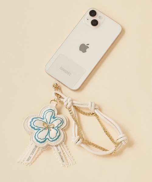 【「BOUQUET OF JOY」フラワーモチーフのチャームが登場】 【Design/Styling】 SNIDEL20周年を記念してオリジナルで描き起こしたオリジナルフラワーモチーフがポイントの「BOUQUET OF JOY」のチャームです。エレガントなフェイクレザーフラワーに中綿を入れてふくらみを出し、オリジナルリボンやレースリボンを添えて愛らしく華やかに仕上げました。フェイクレザーストラップやゴールドチェーンもセットにして豪華な仕上がりです。バッグチャームとしても、スマホに挟める透明のスマホシート付きなのでスマホチャームとしても活躍します。プレゼントにもおすすめ。ブルーの縁取りフラワーが涼やかなアイボリー、ホワイトの縁取りフラワーがフェミニンなミント、レッドの縁取りフラワーがレディなピンク、ホワイトの縁取りフラワーが爽やかなブルーの4色展開です。 ※照明の関係により、実際よりも色味が違って見える場合があります。 またパソコン・スマートフォンなどの環境により、若干製品と画像のカラーが異なる場合もございます。予めご了承ください。 商品の色味は、商品単品画像をご参照下さい。 ※商品画像はサンプルのため、色味やサイズ等の仕様に変更がある場合がございますので、予めご了承ください。