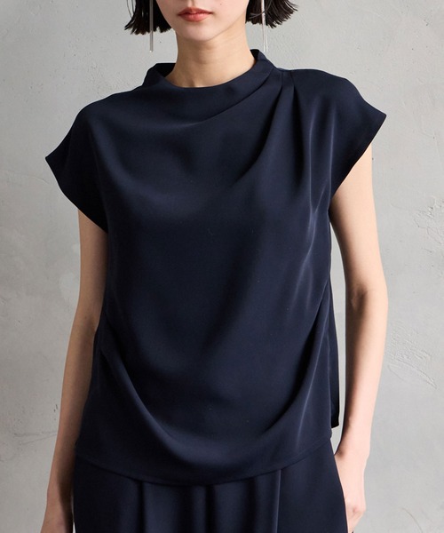 タックドレープが上品な印象のフレンチスリーブブラウス。落ち感と程よいツヤ感のあるダブルクロス素材を使用。 素材特有のとろみを生かし、肩やウエストにタックを入れ、ナチュラルなドレープをデザインしました。 首元が少し詰まったボトルネックが露出を抑えながらもエレガントな印象で、ジャケットなどもレイヤードしやすくなっています。 着丈はボトムインでもアウトでもきれいに着れるバランスに仕上げました。 同素材のワイドパンツ(品番:0366-5-01600)とセットアップで着用するときちんとした印象に。 コーディネート次第で幅広いシーンに着用可能なブラウスです。 ※照明の関係により、実際よりも色味が違って見える場合があります。 またパソコン・スマートフォンなどの環境により、若干製品と画像のカラーが異なる場合もございます。 予めご了承ください。