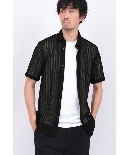 【DESIGN】透かし編みが特徴のラッセルレースストライプ素材を使用したレギュラーカラー半袖シャツ。コンパクトなレギュラーカラーに、程よくゆとりを持たせたボックスシルエットを採用し、上品なヌケ感のあるレイヤードスタイルを演出します。【TEXTILE】透け感のあるラッセルコードレース素材。ストレッチ性があり、おうとつ感のあるサラッとした肌さわりで、快適に着用できる素材です。
