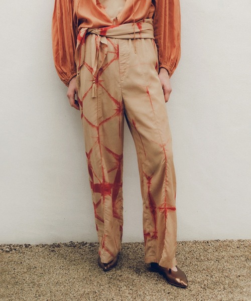 手作業のタイダイ染めが贅沢な、コットンブレンドのイージーパンツ■デザイン/シルエット タイダイ染めの柄を活かしたシンプルなデザイン。 歩くたびに揺れるような落ち感が美しい、ワイドシルエットパンツ。 ゆとり感がありながら落ち感のある素材なので腰回りはスッキリとした印象で着て頂けます。 ウエストはオールゴム仕様でリラクシーな履き心地。 紐を絞れば、ウエストサイズも調整可能なので、幅広い体型の方に対応可能です。 ■素材 上品な艶感と滑らかな肌さわりが心地よい、 コットン/ヴィスコースのローンをタイダイ染めた独特の表情感のある仕上がり。 シアー感のあるキレイ目な素材に落とし込むことでナチュラルになりすぎず洗練された印象に。 手作業で染められているので1つ1つの表情が微妙に異なりますが1点ものとして希少性のある商品です。 ご自宅で手洗い可能なのも嬉しいポイント。 ■コーディネート シンプルなTシャツやタンクトップなどにプラスするだけでリゾート感のあるムードを出せる一枚です。 ■タイダイシリーズ一覧 ・商品番号:SHM35210 商品名:タイダイTシャツブラウス ・商品番号:SHS35210 商品名:タイダイパンツ ・商品番号:SHN45020 商品名:タイダイ染めスカーフ ■モデル身長:174m 着用サイズ:F ーーーーーーーーーー 裏地:あり 光沢感:なし 透け感:ややあり ウエスト:ゴム ポケット:あり 伸縮性:なし 生地の厚さ:やや薄手 ーーーーーーーーーー ※画像の商品は光の照射や角度、お使いのモニター環境(パソコン・スマートフォン)により、色味が違って見える場合があります。 ※商品の色味は、商品アップ画像をご参照ください。