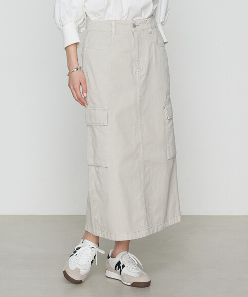 《デザイン》カーゴパンツのディテールを落とし込んだスカートです。立体ポケットを下の方に付けてバランスを面白くしています。大人っぽくIラインシルエットにし、バックスリットで足さばきを良くしています。ウエストゴムで楽ちんに着られます。《素材》コンパクトな表面感のツイルです。一般的には右上がりの生綾に対して、左上がりの逆目に織っているのが特長です。ワークウェアにも使用される素材感です。製品の状態で染色することで、やわらかな風合いに仕上げています。お手入れ:手洗いOK《お取り扱い注意》この製品は、独特の風合いをだす為、製品染めをしています。手洗いの際は直接製品に洗剤をかけずに、必ず先に水を張ってから洗剤を充分溶かし、そこに製品を入れて洗って下さい。