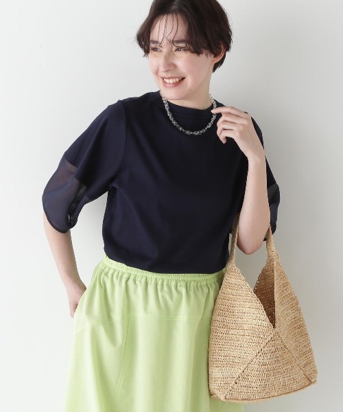 シンプルながら存在感のある、着映えデザインカットソー 【デザインのポイント】 コクーンハーフスリーブの下側をシアー素材で切り替えたモックネックプルオーバーです。 【素材のポイント】 表地には毛羽の少なく繊細でフラットな表面感の安心感ある肉感ながらも接触冷感性を持つスムースジャージーを使用。別布にはコットンのようなハリコシとナチュラル感のあるシアーポリステルスパンボイルを使用しています。 【おすすめコーディネート】 シンプルながらハリ感のあるきれい目デザインのカットソーなので、オンオフ問わず活躍します。ベーシックな丈感でインもアウトも出来るボトムスを選ばない一枚です。 【お買いものをよりお楽しみいただく為に】 ■商品のお気に入り登録 再入荷・残り1点・セールの通知を受け取ることができます。 ■ブランドのお気に入り登録 新商品・再入荷/タイムセールやクーポンなどの ブランドの情報を受け取ることができます。 ------------------------------------------- 【human woman】 1998年よりスタートした”フレンチトラッド”をベースにした大人な女性のためのカジュアルブランド。 素材や縫製にもこだわってつくられた上質な日常着は、長い時間大切にお使いいただけるようにお作りしています。 約20年の歴史の中で、「数年着続けても安心感があるお洋服」と多くの方に高いクオリティを認められてきました。 ベーシックなアイテムにさりげなく加えたトレンド感で、「私らしいカジュアルスタイル」を見つけてみませんか。 「カジュアルが好き」「少しだけトレンドも取り入れたい」 「大切に着たい」「私らしくいたい」そんな思いをかなえるお洋服をhuman womanでは提案しています。 -------------------------------------------