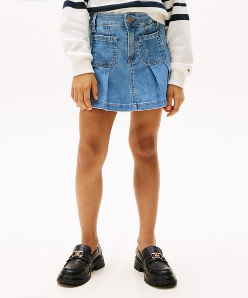 GIRLS プリーツデニムスカート 幅の広いボックスプリーツが施されたデニムスカート。腰周りはヒダを内側から縫い留めているため、トップスとの収まりがよく、すっきりと着こなせます。軽やかな膝上のミニ丈で、ガーリーなカジュアルスタイルに。フロントにはアクセントを兼ねたパッチポケットを配しています。 【TOMMY HILFIGER】 永遠のアメリカンクラシックをベースにモダンなひねりを加えたデザインが人気のトミーヒルフィガー。都会的で洗練されたメンズ・ウィメンズに加え、チルドレン、ゴルフライン、そしてよりカジュアルなデニムラインと豊富なカテゴリーが揃うグローバルブランド。